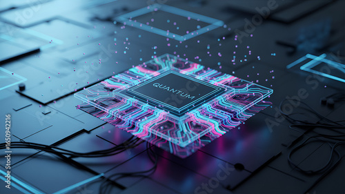 Fototapeta - Closeup of a quantum computer chip with glowing blue and pink lights