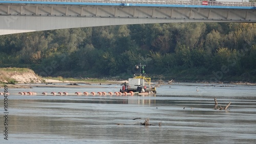 Fototapeta - Oczyszczanie dna rzeki pod mostem za pomocą specjalistycznego sprzętu.