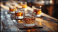 Fototapeta - Close-up of a glass of whiskey with ice cubes on a wooden coaster placed on a rustic wooden table with multiple blurred glasses of whiskey in the background creating a warm, cozy atmosphere