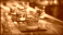 >Naklejka na meble>Close-up of a glass of whiskey with ice cubes on a wooden coaster placed on a rustic wooden table with multiple blurred glasses of whiskey in the background creating a warm, cozy atmosphere
