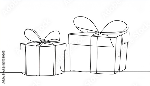 Continuous line art drawing of two gift boxes with bows. Minimalist design for presents, celebrations, and special occasions.