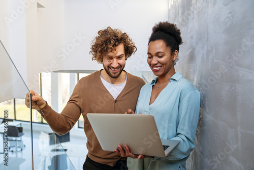 Fototapeta - Team collaboration and digital transformation with colleagues sharing ideas at a laptop in office