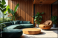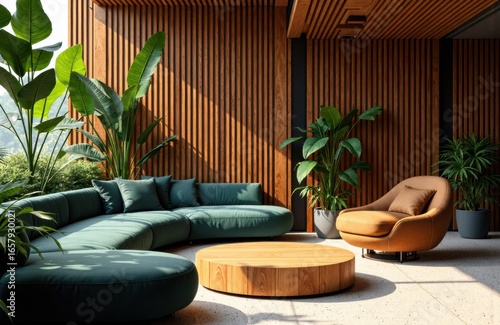 Fototapeta - Modern indoor lounge area with stylish furniture and lush green plants
