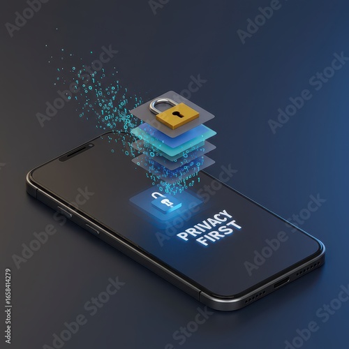 Fototapeta - Smartphone displaying privacy first message with padlock layers, concept of mobile data encryption, secure communication, personal privacy protection technology