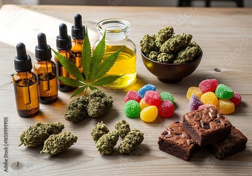 Fototapeta - Assortment of cannabis products including oil tinctures buds edibles and gummies on a wooden surface