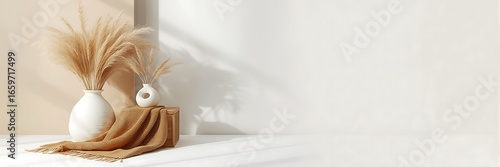 >Naklejka na meble>Minimalist interior scene with pampas grass in vases, a soft blanket, and natural light creating a serene and modern home decor aesthetic