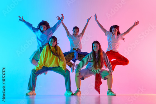 Fototapeta - A dynamic group of diverse young adults showcases youthful urban dance culture in a vibrant, colorful performance. Concept of modern city arts and youth expression.
