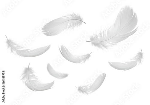 Fototapeta - Several delicate white feathers floating isolated on transparent background