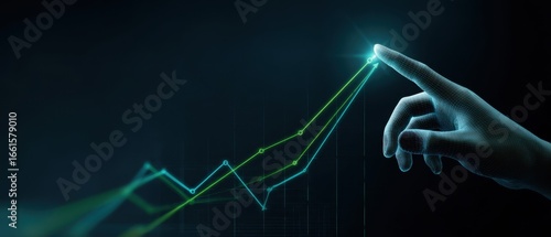 Fototapeta - The hand reaching towards a digital growth trend in a futuristic environment.