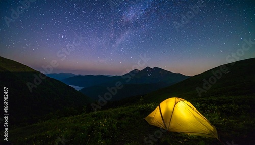 Fototapeta - Illuminated tent nestled in a mountain valley under a starlit night sky