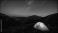 Illuminated tent nestled in a mountain valley under a starlit night sky