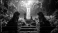 Serene waterfall view surrounded by lush green forest and ancient stone sculptures on a misty day.