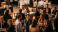 >Naklejka na meble>A high-angle shot of a lively networking event. Professionally dressed people converse and mingle in a spacious, dimly lit venue. Drinks and appetizers are present.