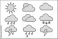 >Naklejka na meble>Cartoon weather symbols representing diverse conditions including sun, rain, snow, clouds, thunderstorms, and partly cloudy skies on a transparent background, vector illustration