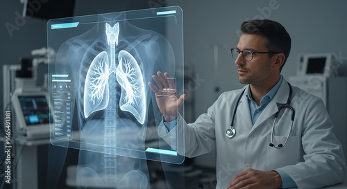 Fototapeta - A Doctor Interacts with a Digital Hologram of Lungs. This represents advanced medical technology, futuristic diagnostics, and AI-powered respiratory healthcare