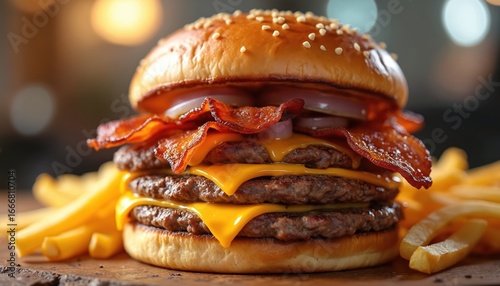 Fototapeta - Juicy double smash burger stacked high with crispy bacon, melted cheddar cheese, fresh onions. Served alongside golden french fries. American classic offers delicious, hearty, indulgent fast food