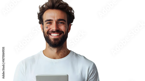 young handsome american man happy face smiling use tablet isolated on a transparent background