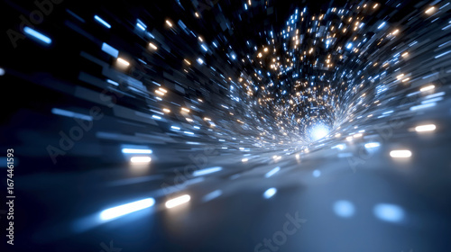 Fototapeta - Glowing pixelated wormhole in space creates mesmerizing visual effect, with bright lights swirling and moving rapidly towards central point. scene evokes sense of wonder and exploration