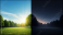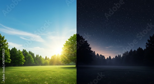 Fototapeta - Vibrant day and starry night split of a serene park landscape