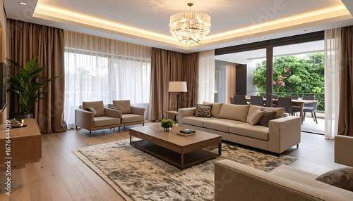 Fototapeta - ホテルのような上質感漂う開放的な住宅リビングとダイニング