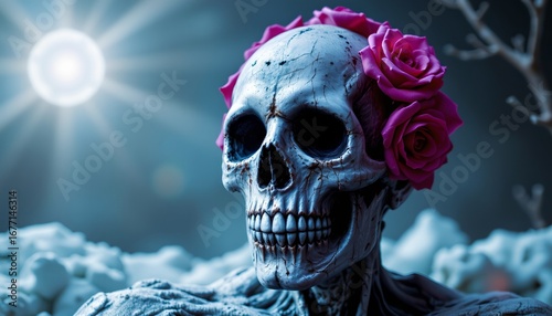 Fototapeta - A skeleton with an arrangement of flowers placed on its head, holding what appears to be a rose. The background is dark with hints of blue and black, creating a somber atmosphere