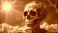 >Naklejka na meble>A skeleton with an arrangement of flowers placed on its head, holding what appears to be a rose. The background is dark with hints of blue and black, creating a somber atmosphere