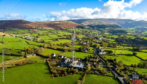 A vibrant rural landscape displays rolling hills, lush green fields, and a communication tower standing tall amidst the countryside.