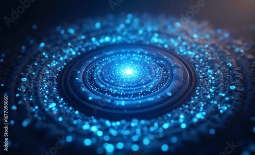 Fototapeta - A vibrant blue energy core radiates amidst swirling luminous particles, forming an abstract, futuristic vortex of light.