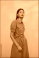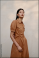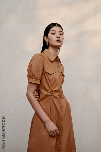 Fototapeta - Modern woman in brown dress standing against a simple background.