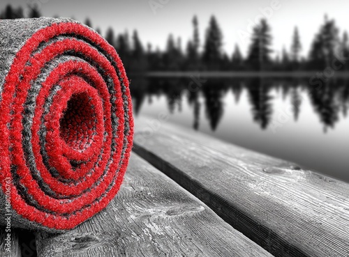 Fototapeta - Rolled grey mat with red edging on wooden dock, lake background