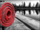 Rolled grey mat with red edging on wooden dock, lake background