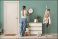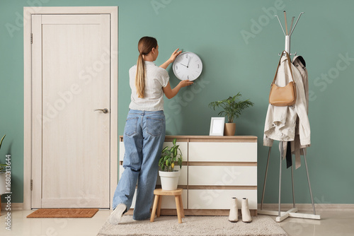 Fototapeta - Young woman hanging clock on green wall in hallway, back view