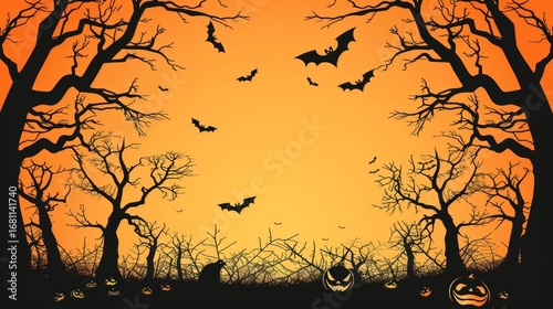 Fototapeta - Eerie halloween landscape featuring haunting shadows, gloomy skies, and mysterious silhouettes