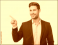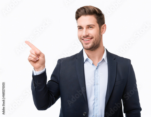 young businessman pointing finger happy smiling guy business man in suit point away on white background