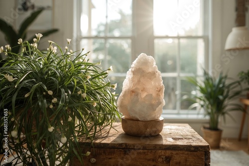 Fototapeta - Close-up view of a salt lamp and a plant placed on a wooden crate by a window