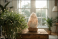 Close-up view of a salt lamp and a plant placed on a wooden crate by a window