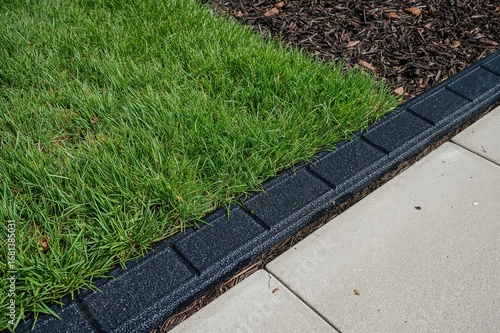 >Naklejka na meble>Installation of black plastic garden edging creating a distinct boundary between lawn and flowerbeds to prevent grass encroachment into mulched areas