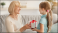 >Naklejka na meble>Celebrating Concept. Portrait of cute little girl making surprise for her grandma holding and giving present box, greeting woman with holiday. Granddaughter congratulating smiling mature lady