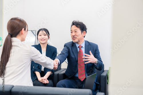 Fototapeta - 笑顔で握手を交わす3人のビジネスパーソン