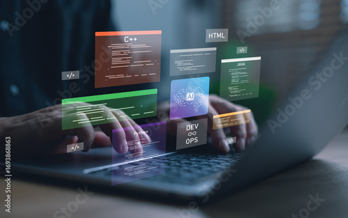 Fototapeta - Developer coding with multiple programming languages on laptop, including Python, Java, C++, and HTML, representing AI development, DevOps and modern software engineering.