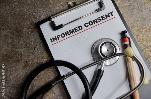 Fototapeta - Concept of informed consent write on clipboard isolated on Wooden Table.