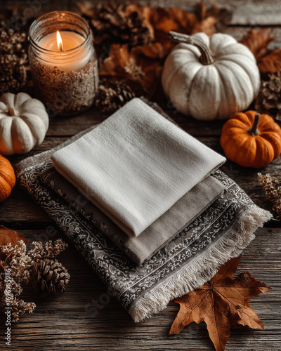 >Naklejka na meble>Kojąca kompozycja jesienna z palącą się świecą w słoiku, małymi dyniami, szyszkami i suszonymi liśćmi, ułożona obok stosu tekstyliów na drewnianym stole.