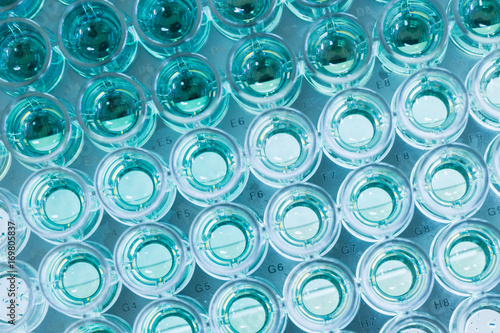 Fototapeta - Close - up 96 well plates on lab table with Blue liquid samples