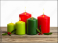 Conjunto de velas verdes y rojas, con muérdago, y fondo blanco