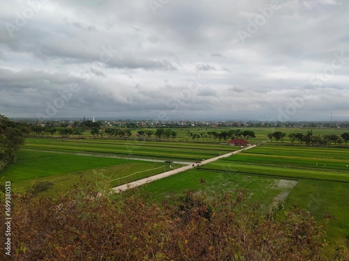 A fresh agricultural landscape with rice fields and a rural environment in the cloudy morning.