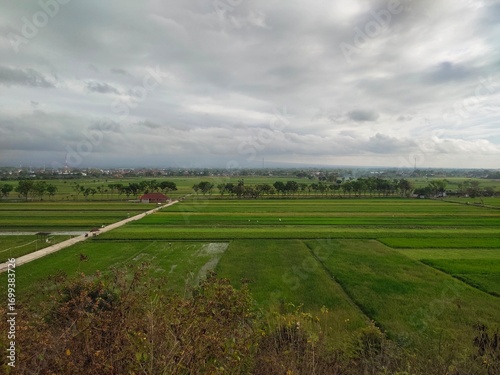 A fresh agricultural landscape with rice fields and a rural environment in the cloudy morning.