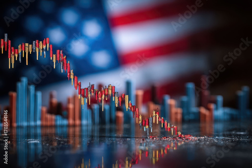 A stock market chart shows a downward trend against a blurred American flag backdrop, symbolizing economic challenges or market decline.