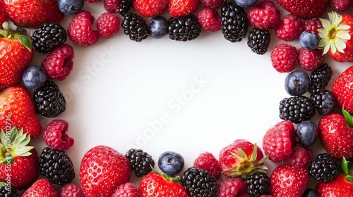Fototapeta - rectangular berry wreath of strawberries raspberries blackberries blueberries and gooseberries edging an empty center