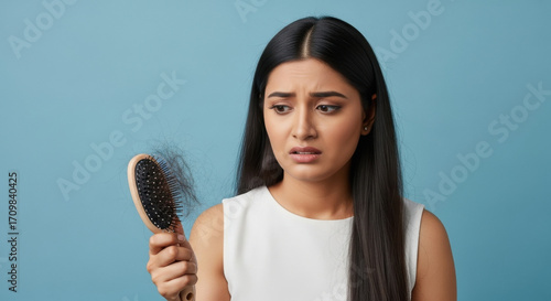 Fototapeta - young indian woman holding hair brush suffering from hair fall