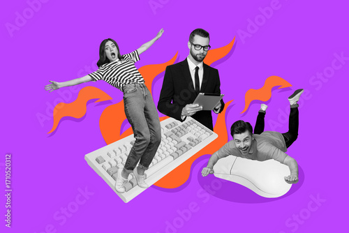 Fototapeta - 3d banner art pop trend collage of happy business partners stand keypad mouse tool freelancer girl men it-specialist occupation